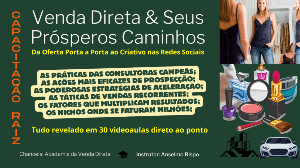 A Academia da Venda Direta é um agrupamento de conteúdos instrucionais voltados para a Qualificação Plena do(a)s Vendedore(a)s, Consultore(a)s e Empreendedore(a)s do ramo de Vendas de produtos e serviços físicos e digitais, de qualquer natureza, como: Cosméticos, Roupas, Joias, Autos, Consórcios, Seguros, Imóveis, etc.